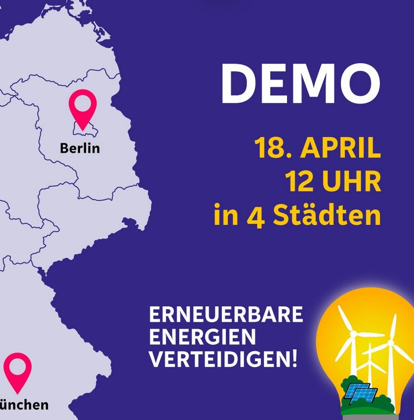 Den Ausbau der Erneuerbaren will Katherina Reiche ausbremsen – für die Profite der Öl- und Gaswirtschaft. Dagegen schließen wir uns zusammen – als Bürger*innen, Demokrat*innen, Verbraucher*innen und Klimaschützer*innen, als Beschäftigte, Installateur*innen und Investoren aus den Erneuerbaren-Branchen, als Menschen aus allen Generationen. Jetzt ist es an der Zeit, dass wir die Energiewende verteidigen! Wir rufen für Samstag, den 18. April zu gemeinsamen Demos auf – in Berlin, Hamburg, Köln und München.